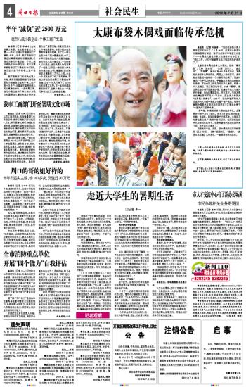本报讯 (记者 刘俊涛)“现在村里很少有人再学这样的活计了。”7月18日,记者在太康县马头镇吴振岗村采访,被评为河南省非物质文化遗产——木偶戏代表性传承人的吴培中告诉记者:“再过几年,人们可能就再也见不到这样的好东西了。”