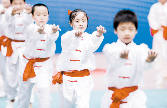 7月20日,来自重庆渝北的小学生在表演少儿武术操。当日,第九届全国武术之乡武术套路比赛在重庆市渝北区开赛。本次比赛为期三天,共有来自全国79个武术之乡的800余位选手参赛。( 新华社发)