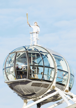伦敦奥运会火炬登上“伦敦眼” 7月22日,英国探险家、伦敦奥运会火炬手戴维·亨普勒曼-亚当斯在“伦敦眼”上展示奥运火炬。当日,伦敦奥运会火炬传递继续在伦敦进行。 新华社发