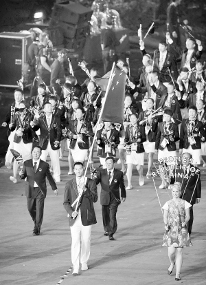 7月27日,第三十届夏季奥林匹克运动会开幕式在伦敦奥林匹克公园主体育场“伦敦碗”举行。这是中国体育代表团在旗手易建联的引领下步入开幕式会场。(新华社 发)