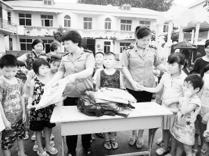 7月初以来,太康县工商局雷锋“红盾”志愿服务队队员积极与全县各个乡村的留守儿童结成帮扶对子,争做留守儿童“爸妈”,定期上门与留守儿童谈心,讲解食品安全消费等安全常识,防止安全事故发生。图为8月6日,该县工商局城郊工商所2名女干部在向结对帮扶的留守儿童发放书包、文具等。