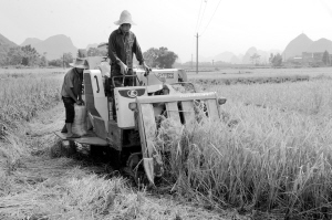 8月7日,广西罗城县四把镇新印村坝心屯群众在收割早稻。当日是二十四节气中的立秋,受台风“苏拉”的影响,广西各地接连数日降雨,农民们抓住有利时机管护农作物,为全年农业丰收打好基础。(新华社发)