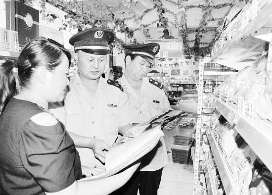 近日,扶沟县工商局全面启动流通领域放心奶、放心肉、放心菜和放心豆制品“四大食品安全放心工程”,加大市场巡查力度,强化食品市场日常监管,切实将食品质量安全监管工作落到实处,不断提升食品安全日常监管的制度化、规范化水平。图为该局执法人员在食品经营户门店进行检查。(卢付昌 摄)
