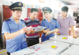 日前,扶沟县工商局组织执法人员开展家电广告专项整治行动,对家电广告进行严格登记管理,严禁超出登记事项擅自夸大宣传。图为该局执法人员在对一家电广告宣传材料进行检查。