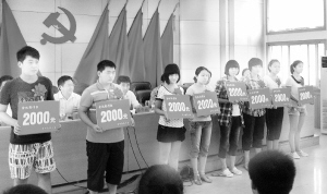昨日,淮阳县总工会为该县120多名贫困准大学生发放42万元善款。图为助学善款发放现场。(记者 侯俊豫 摄)