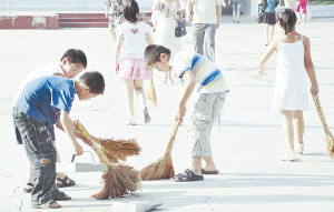 图三:一定要把校园打扫干净。(记者 王映 摄)