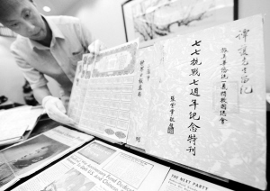 中国人民抗日战争纪念馆新添华侨抗日文献文物 9月3日,中国人民抗日战争纪念馆的工作人员在整理获捐的文物文献。当日,“招思虹暨金山之路读者团队”捐赠华侨抗日文献文物仪式在中国人民抗日战争纪念馆举行,这些珍贵的文物包括:旧金山、纽约等地华侨援助祖国抗战的相关文物及资料、日本侵华的罪证以及抗战时期的各种救国公债券、邮票、地图、画报、海报、照片、明信片等。 新华社记者 罗晓光 摄