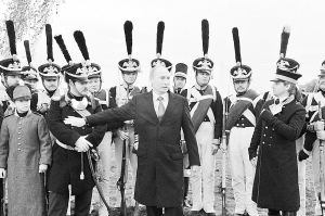 俄罗斯总统普京参加博罗季诺战役200周年纪念活动 9月2日,在俄罗斯首都莫斯科西郊的博罗季诺,俄罗斯总统普京(前中)和参加纪念活动的演员进行交流。 新华社发