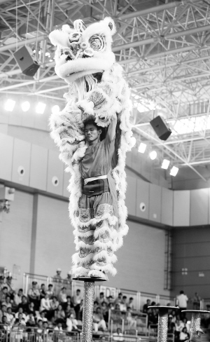 狮王争霸梅花桩 9月17日,湖北队在舞龙舞狮比赛南狮规定项目的比赛中。当日,全国农运会舞龙舞狮比赛在南阳市唐河体育馆进行。 新华社记者 燕雁 摄