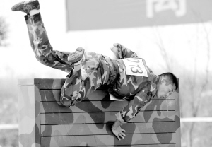 民兵军事三项开赛 9月17日,山西选手闫先卫在男子400米障碍比赛中攀越高墙。