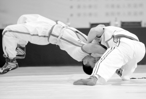 农运会中国式摔跤开赛 9月17日,新疆选手爆音吉日嘎拉(左)与安徽选手郑智翔在男子62公斤级比赛中。