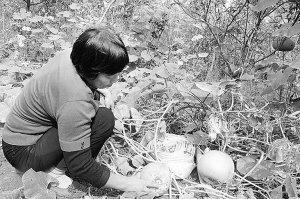项城市结合人力资源优势,示范引导农民大力发展特色种植,实现增收致富,使许多农户走向致富路。图为农民李青丽正在自己的果园里察看南瓜长势。(赵献伟 摄)