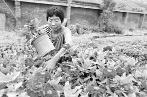 9月17日,商水县城关乡大刘村一名妇女正起花装盆。该县积极推进农业产业化发展进程,走出了一条政策引导、市场化运作发展的花卉种植新路子,实现了农村经济实力的不断提高。