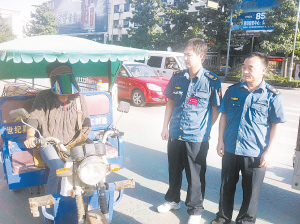 昨日,两名运管执法人员在对过往三轮车进行排查。“双节”临近,我市运管部门抽调工作人员对城区机动三轮车非法营运现象进行检查,确保市区交通安全。