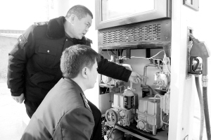 3月24日,质监局执法人员在检查加油机铅封。为配合全县农资打假活动的开展,鹿邑质监局组织执法人员,对全县加油机进行全面检查,确保农民春耕用油秤准量足。(记者 杜少华 通讯员 杨新才 摄)