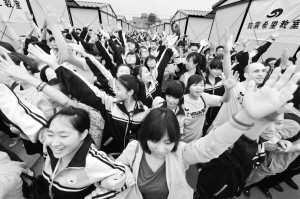 5月6日,在芦山中学的复课仪式上,学生和志愿者一起高举双手为明天祈福。当日,雅安地震灾区329所中小学校、7所中职学校全面复课。
