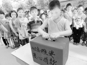 商水县舒庄乡杜店小学留守儿童正在为雅安灾区捐款。该校现有农村留守儿童420名,当日,学校组织师生为雅安地震灾区捐款3860元。(乔连军 摄)