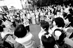 鼓励 6月7日,在广西南宁市第十四中考场外,即将入场的学生在呐喊加油。当日,2013年高考拉开帷幕,今年共有912万考生报名参加考试。