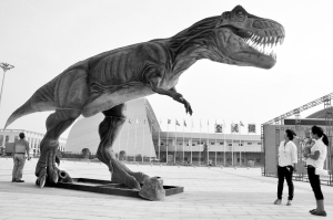 昨日,市民在市体育中心观看2013秋季“佳利地产杯”周口大型房车联展展会恐龙模型。本届房车联展亮点纷呈,主办方与商家携手为广大市民们准备了直升机航空展、恐龙科技展、百名少年书画展等等,欢迎广大市民前来观看。(记者 王映 摄)