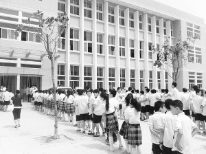 文昌中学今秋招生后,积极开展校园文化建设,学校正向正规化、规范化、优质化快速迈进。图为午餐时学生排队就餐。