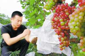 商水县邓城镇大学生村干部张耀在当地党委、政府的支持下,流转160亩土地创办特色葡萄园,吸引了周边市民到园区内采摘,取得了良好的经济效益和社会效益。他先后获得“周口市新长征突击手”、“河南省优秀大学生村官”、“周口市十大优秀青年”等荣誉称号。图为张耀在查看葡萄成熟情况。(吕耀光 王新建 摄)