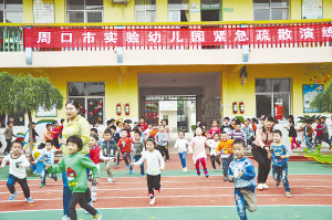 近日,随着警报声响起,市实验幼儿园1100多名幼儿在老师、保育员的带领下进行了安全疏散演练。通过演练,幼儿了解了正确的应急逃生方法,全园教职员工提高了应急反应能力。记者 王映 摄