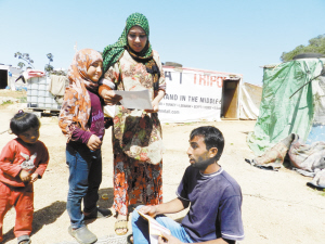 3月29日,在黎巴嫩东部贝卡地区,一家叙利亚难民看仍在叙利亚的亲友照片。 联合国难民事务高级专员公署(难民署)28日在贝鲁特宣布,迄今逃到黎巴嫩寻求难民身份的叙利亚人达99万,比上周增加1万人。