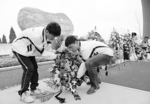 ▲ 3月30日,参加落成仪式的学生为“黄河葬”纪念碑敬献花圈。当日,宁夏银川市“黄河葬”纪念碑落成仪式在银川市福寿园举行。据了解,为倡导和推广节地、生态丧葬方式,给参加黄河葬的逝者家属提供一个追思、遥祭亲人的场所,银川市民政局、银川市福寿园联合建造了“黄河葬”纪念碑。自2011年银川市开展“黄河葬”活动以来,已有100多位骨灰葬入黄河的逝者姓名篆刻在纪念碑上。