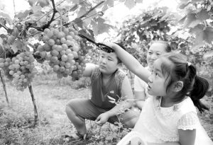 我市龙头企业、西华县东王营乡玉桂千亩生态葡萄园目前硕果累累,每天有众多游客前来观赏。该园种有“香妃”、“夏黑”、“金手指”、“醉金香”等15个优质品种,每年采摘期从7月中旬到10月中旬。 (记者 沈湛 摄)