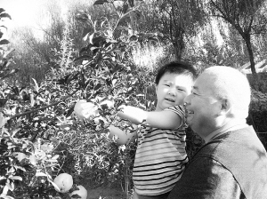 昨日,在康湾的石榴园内,爷孙俩高兴地采摘成熟的石榴。川汇区康湾居民利用地域优势,在沙河边种植优质石榴,现在果实已经成熟,吸引不少市民游玩采摘,同时增加了收入。(记者 孙安平 摄)
