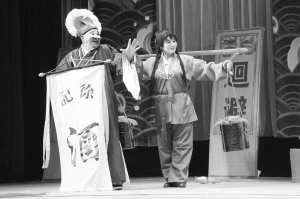 《徐九经升官记》是一出名戏,是湖北省京剧院朱世慧的代表作,选择这个戏参赛本身就是对自己的挑战。它首先要求行当齐全,生、旦、净、丑同台,演员众多,演出规模大;其次,对演员要求高,唱、念、做、舞丰富,这就要求演员的基本功必须扎实。而对饰演一号人物徐九经的演员来说要求更高,对“丑”行技术的掌握要全面,对唱念的运用要娴熟,这是塑造好徐九经这个人物的先决条件。对徐九经这个角色,即便是青年演员一般都心生畏惧,甭说是一位耄耋老人了。令人惊讶的是,赫世海老先生嗓音洪亮,不仅善唱,且唱得越调韵味很浓,尤其是核心唱段“当官难,难当官”,一气呵成,未显气喘,架子不散,真是宝刀未老。宋凤霞饰演的李倩娘、于秀玲饰演的刘钰、王玉珍饰演的尤妃,唱功甚佳,也与人物性格比较吻合。令人钦佩的是原县文化局副局长王斌,虽已退居二线,仍以一个文艺老兵的姿态饰演一个“门吏”,且扮戏认真、念白清晰、一丝不苟,给观众留下了很深的印象。《徐九经升官记》的整台演出比较严谨、规范,音乐唱腔设计、伴奏亦很规矩,追求原汁原味。美中不足的是舞美比较简陋、装置还不够到位,这些有待进一步完善。盛赞之余,感叹的是这支队伍老化,没有新人,每次参赛都是老面孔,我们为这个艺术团队的未来感到担忧。