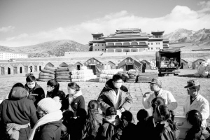 11月23日,木雅祖庆学校的小学生在接受身体检查,不远处是运抵的救援物资。