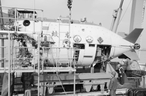 11月23日,工作人员对安装在母船上的“蛟龙”号载人深潜器进行加固。当日,在江苏省江阴市苏南国际码头,“蛟龙号”载人深潜器顺利安装至试验母船“向阳红09”船,将于11月25日远赴西南印度洋执行2014至2015年“蛟龙”号载人潜水器试验性应用航次第二、三航段任务。 新华社发