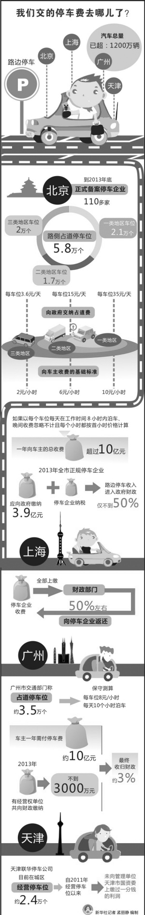 记者调查发现,北京和上海至少有一半停车费没有进入政府口袋,广州也很少,而天津地方财政的相关收入甚至是零。