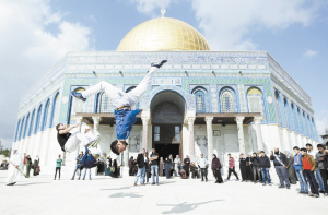 金顶前的跑酷 11月21日,做完礼拜的巴勒斯坦青年人在耶路撒冷老城的金顶清真寺前练习跑酷。 新华社发