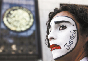 悲伤 11月22日,在墨西哥首都墨西哥城,一名化妆的学生参加抗议。 今年9月26日晚,数十名师范学校学生乘坐的汽车在伊瓜拉市附近遭到当地警察和犯罪分子的袭击,6名学生当场死亡,另有43人至今下落不明。这一事件在墨西哥不断引发示威游行。 新华社发