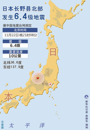 地震发生于当地时间22日22时8分,震中位于长野县北部,震源深度10公里。日本气象厅23日将震级从6.8级修改至6.7级。