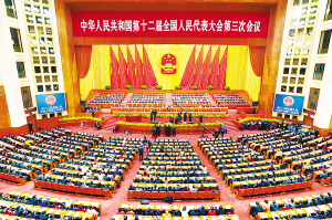 上午9时,张德江宣布:中华人民共和国第十二届全国人民代表大会第三次会议开幕。会场全体起立,高唱国歌。