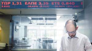 雅典股市重新开市首日创最大单日跌幅 这是8月3日拍摄的希腊雅典股票交易所内的照片。雅典股市在关闭5周后于3日重新开市,当天雅典股票交易所综合指数暴跌16.23%,创最大单日跌幅。