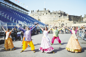 “东西荟萃”爱丁堡国际军乐节 8月3日,来自印度的表演者在英国苏格兰爱丁堡城堡前为游客表演节目。本届军乐节主题为“东西荟萃”。中国人民解放军军乐队时隔11年后将再次亮相爱丁堡国际军乐节。