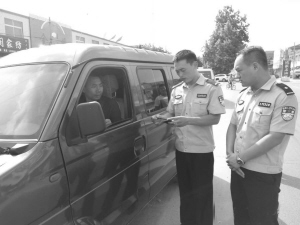 昨日,郸城县公安局全员出动,深入一线,开展道路交通安全整治行动,确保辖区道路安全有序畅通。图为汲冢镇派出所民警正在检查过往车辆。记者 卢好亮 通讯员 孔德鑫 摄