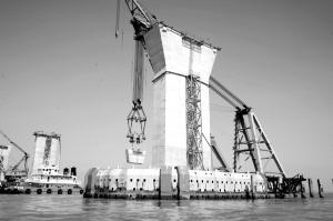 记者当时在现场看到,工人们正在安装港珠澳大桥CB03标非通航孔桥的第60号墩的上节墩身。作为该桥208座墩台中的最后一节墩身,高8.5米,长14米,宽4米,自重为760吨。