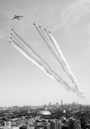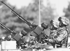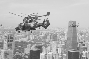 本栏图文均据新华社电 ② ① ③ ④ ⑤ ①领队机梯队飞行在北京上空。 ②直升机梯队在北京上空飞行。 ③轮式装甲突击车方队。 ④抗战老兵乘车方队。 ⑤履带自行火炮方队。
