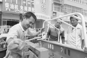 上图 昨日,商水县农机技术人员正在帮助农机户检修小型玉米收割机。为做好“三秋”农机服务工作,该县农机部门选派人员深入到农机合作社和农机户家中进行农机检修,迎战“三秋”。