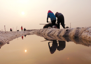 淮盐丰收迎“秋扒” 9月10日,连云港台北盐场工人在进行扒盐作业。 当日起,江苏连云港境内50万亩原盐全面进入“秋扒”作业,工人们加紧收获原盐。新华社发