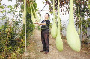 项城市莲花办事处鼓励农民利用田间地头、大棚边角地带发展经济作物种植,“抠”出了土地 ,“抠”来了财富,取得了意想不到的经济效益。图为该办事处农民利用大棚与大棚之间的小路种植的瓠子喜获丰收。据悉,这种瓠子既可食用,也可用来刻画。