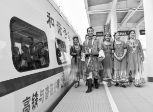 身穿民族服饰的当地居民在吐鲁番北站迎接首批乘坐“高铁杏花专列”抵达前来旅游的游客(2015年3月21日摄)。