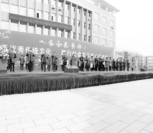 2月23日早晨,在周口市文昌中学门口,学生们走上红地毯,穿过心愿桥,踏上心愿台,进入校园,开始了他们新学期的学习生活。为喜迎学生返校,周口市文昌中学领导班子、部分教师牺牲假期时间,提早准备,为学生们筹划了一场符合学校“习传统文化,做大成教育”理念的开学典礼。典礼以习传统文化为主题,通过武术、太极、书法、诵读经典等节目,表达了学校为家长培养好孩子,为社会培养好公民,为国家培养好英才的育人目标,旨在教育学生在学习生活中践行孝德礼仪。校长朱贵华说,新学期,学校特意聘请山东孔子文化研究院李文文馆长、武龙太极创始人张德全为学校客座教授,进一步以学习优秀传统文化为抓手,开设各种文化社团,努力为学子的终身发展奠定基础。图为全体校领导班子、教师代表在李文文馆长的带领下诵读《学记》的情景。