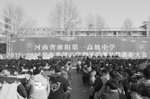 3月3日上午,淮阳一高万余名师生在学校操场隆重举行新学期表彰大会。大会对感动校园人物、优秀班主任、优秀员工、优质课教师、优秀级段等23个项目近500人次进行了表彰。县委宣传部、县人大、县政府、县政协、县教体局有关领导出席会议并为获奖人员颁发了奖状。豆纪锋 摄
