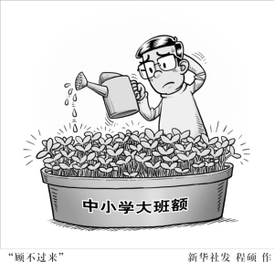 “顾不过来” 一个班级七八十上百人,老师上课要用小喇叭,后排学生站着听讲,三四个学生用一张课桌……近日,“新华视点”记者采访发现,随着越来越多的农村娃进城上学,不少城镇中、小学班级规模超过50人、45人的相关规定,有学校最大班额达150人。大班额、超大班额的教育质量令人担忧。 新华社发 程硕 作